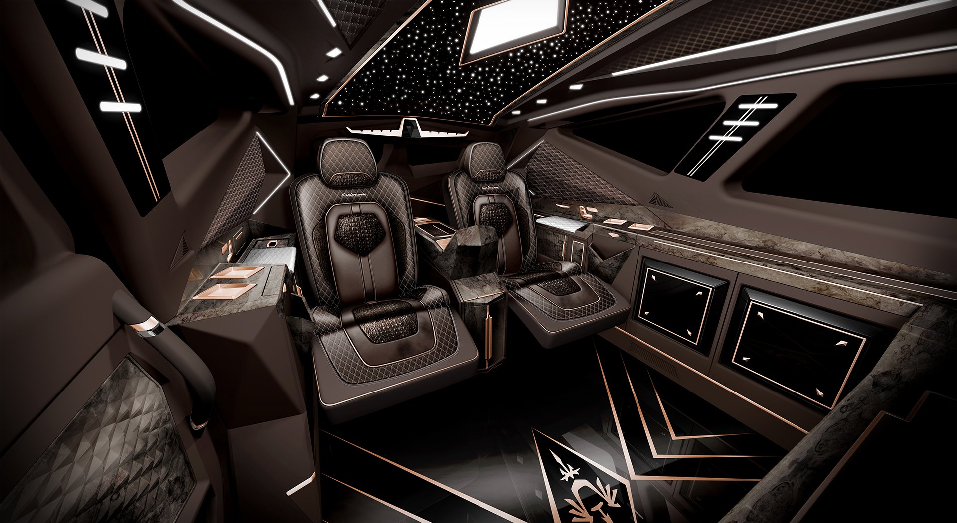 ولكل محبي الفخامة والرفاهية، ستلبي سيارة “Karlmann King” طلبهم وأحلامهم لما تزخر به من التجهيزات الداخلية الفارهة بألوان من عصر الباروك، ويمكن للراكب التحكم في العديد من وظائف السيارة من المقعد الخلفي عبر تطبيق على هاتفه الذكي، الى جانب الإضاءة المحترفة والثلاجة، وبداخلها ايضا ماكينة صنع القهوة للتلذذ بهذا المشروب في مشاوريهم الطويلة ولتقديم واجب الضيافة لركابها.